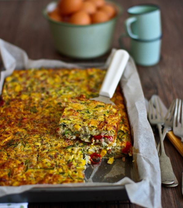 Press half the mixture into a 16 x 26cm slice pan. Bake for 15 mins or until just golden.